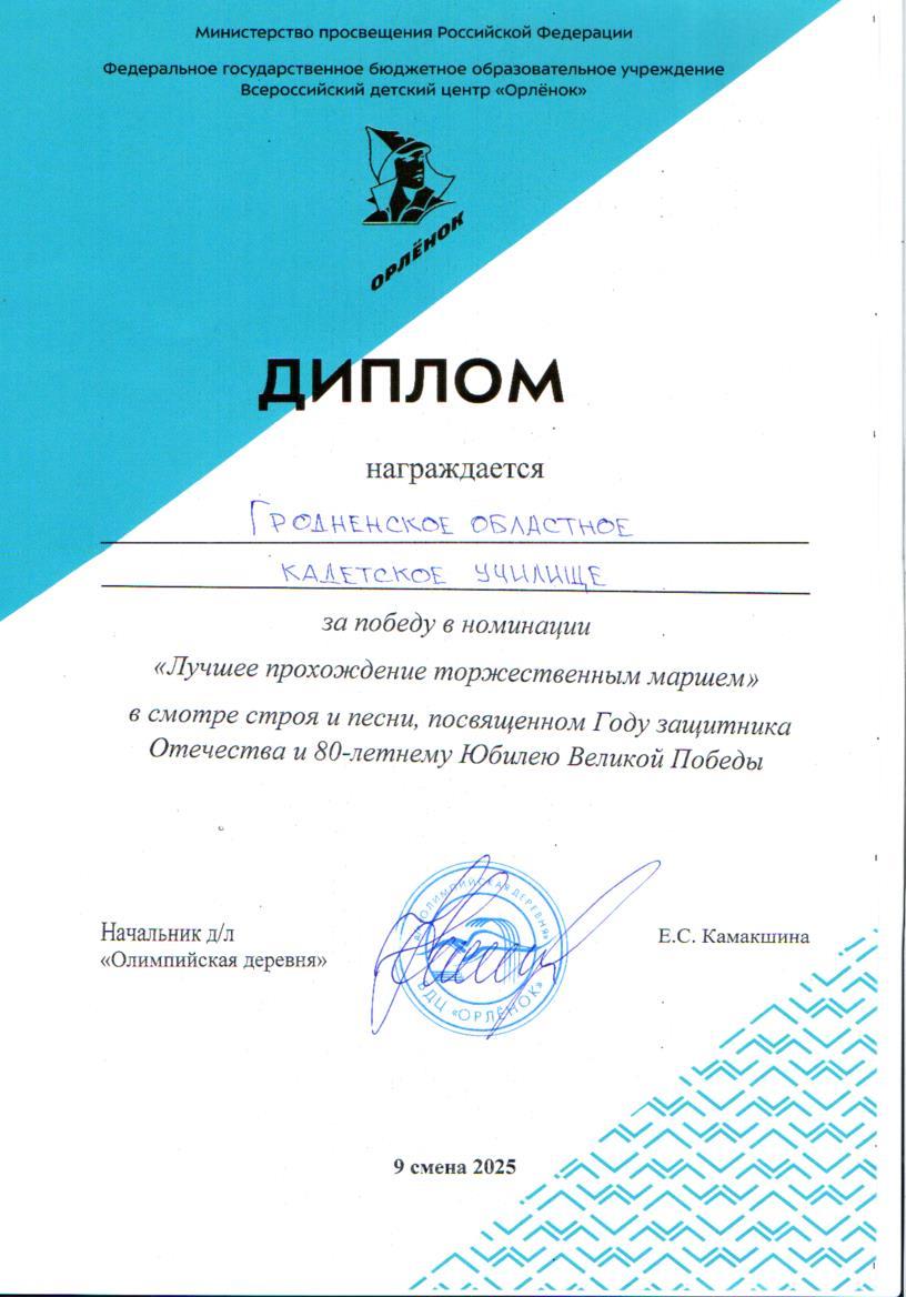 Дипломом награждается Гродненское областное кадетское училище за победу в номинации "Лучшее прохождение торжественным маршем" в смотре строя и песни, посвященном Году защитника Отечества и 80-летнему Юбилею Великой Победы