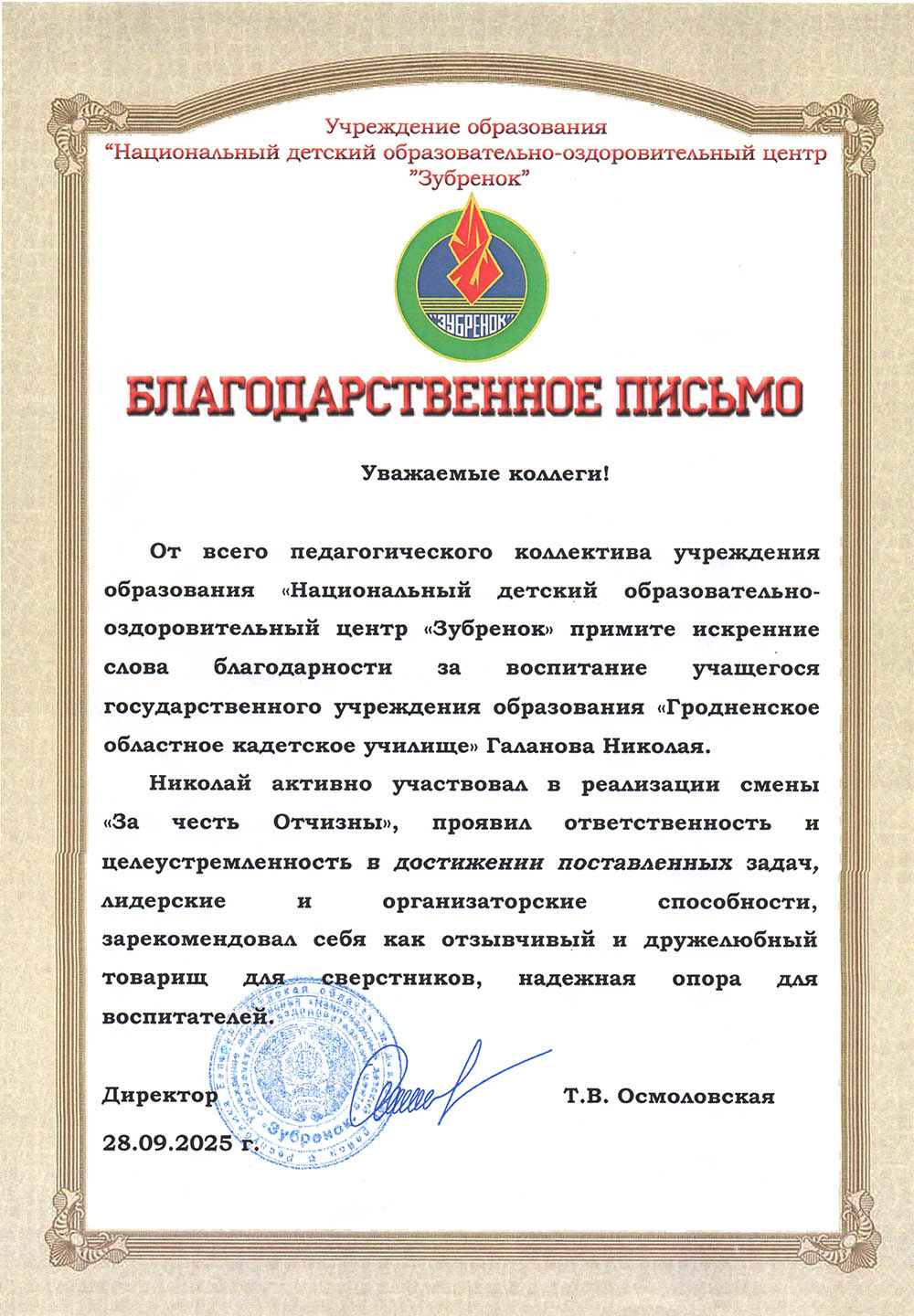 Благодарственное письмо УО "НДЦ Зубренок" за воспитание учащегося ГУО "Гродненское областное кадетское училище" Галанова Николая