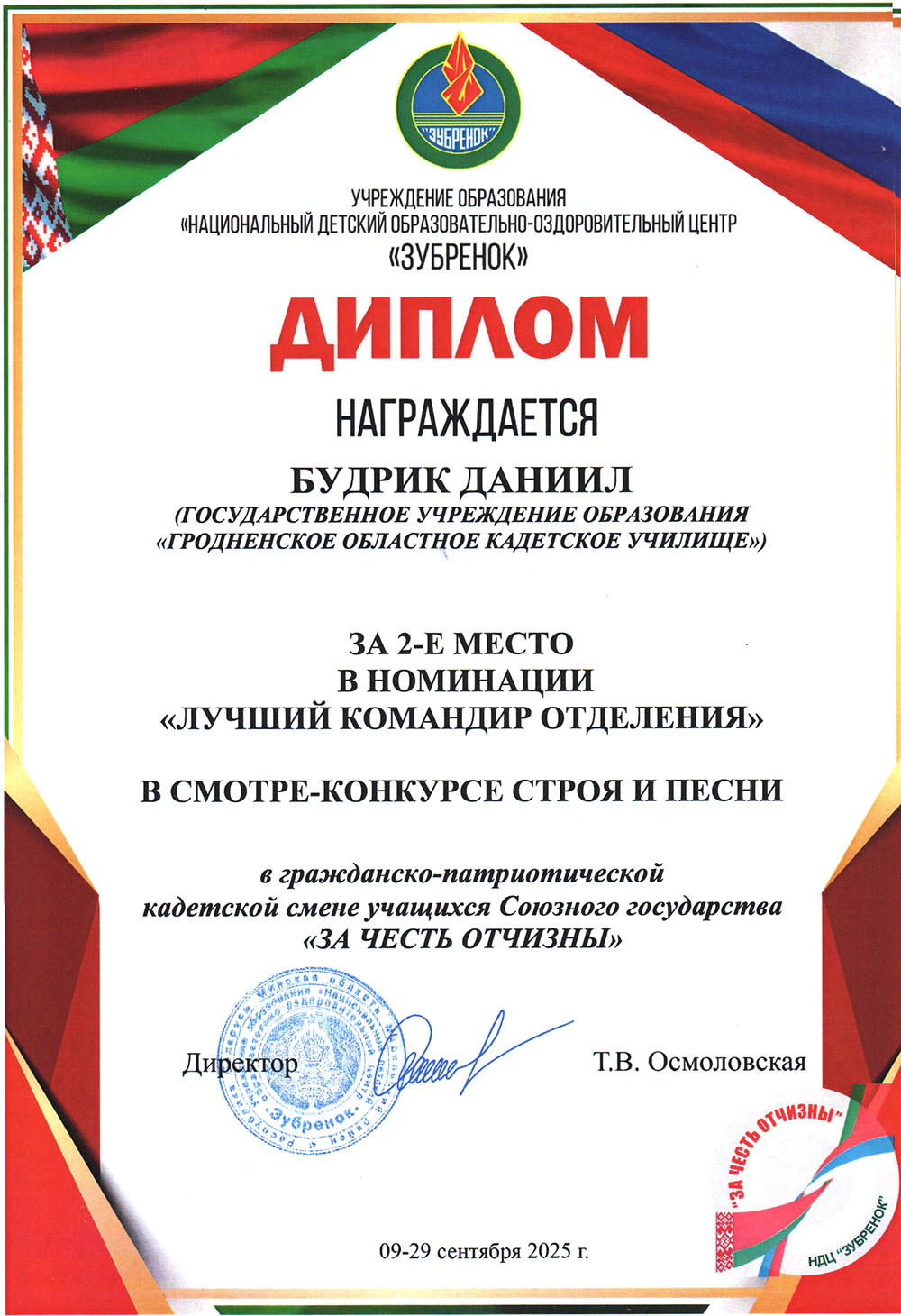Дипломом УО "НДЦ Зубренок" награждается Будрик Даниил за 2-е место в номинации "Лучший командир отделения" в смотре-конкурсе строя и песни в гражданско-патриотической смене учащихся Союзного государства "За честь Отчизны"