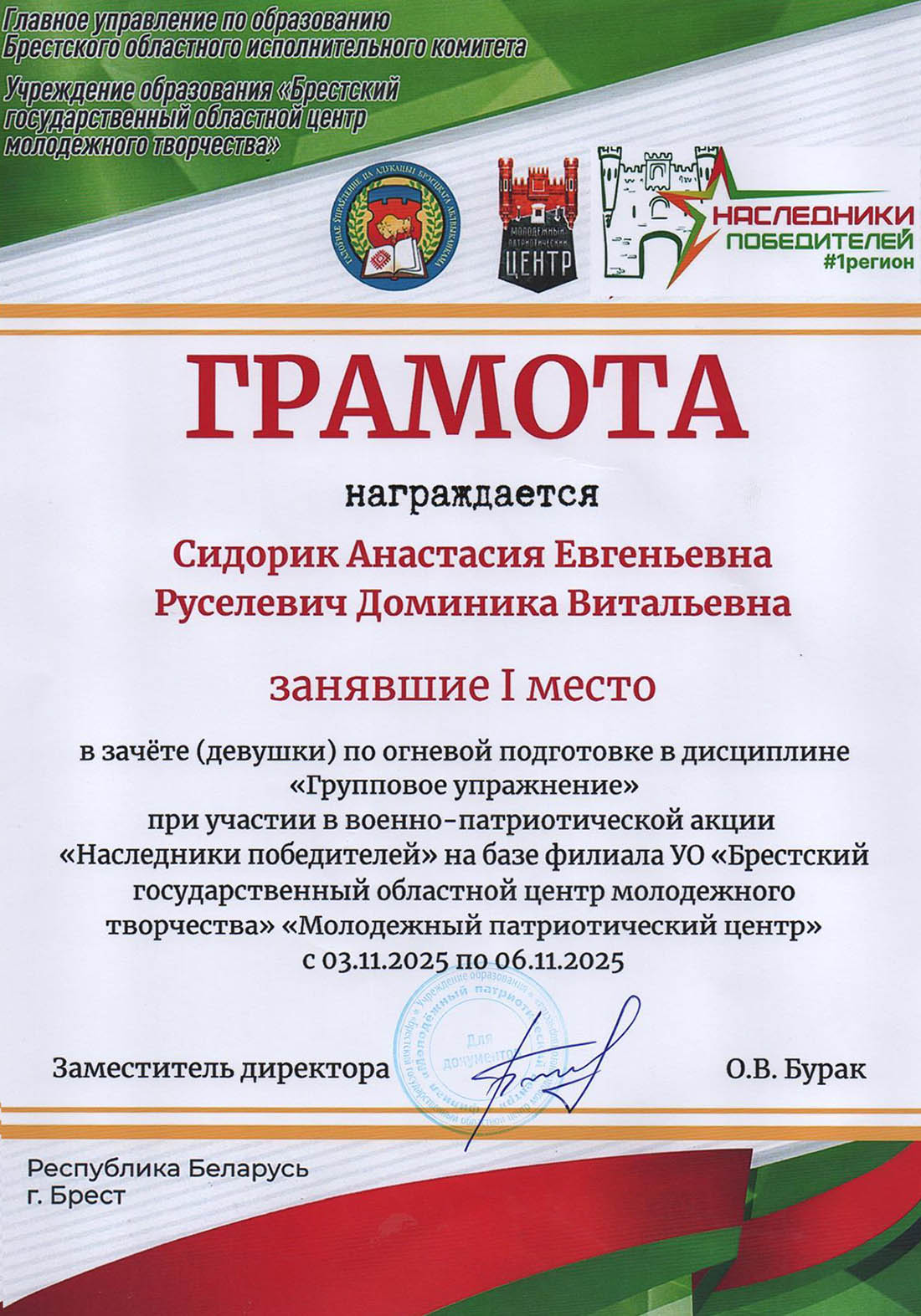 Грамотой награждается Сидорик Анастасия, занявшая I место в зачете(девушки) по огневой подготовке в дисциплине "Групповое упражнение" при участии в военно-патриотической акции "Наследники победителей"