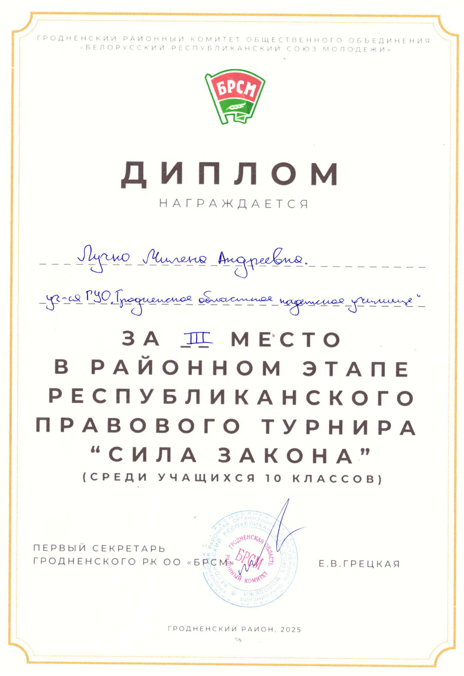 Дипломом награждается Лучко Милена за III место в районном этапе Республиканского правового турнира "Сила Закона" (среди учащихся 10 классов)