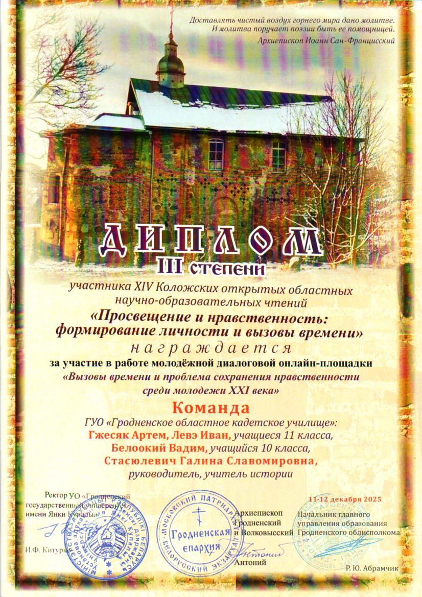Дипломом III степени участника XIV Коложских открытых областных научно-образовательных чтений награждается команда ГУО "Гродненское областное кадетское училище"