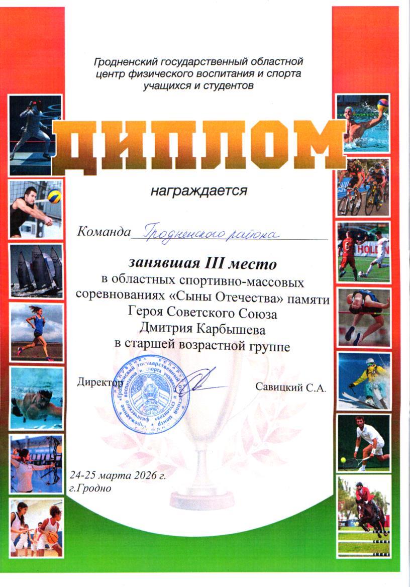 Дипломом награждается команда Гродненского района, занявшая III место в областных спортивно-массовых соревнованиях «Сыны Отечества» памяти Героя Советского Союза Дмитрия Карбышева в старшей возрастной группе